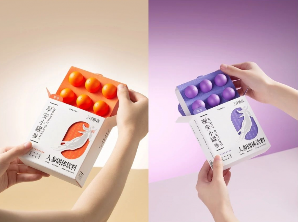 Focusen浮颗森整个品牌logo升级到视觉升级、包装升级的每一个小小的巧思,不仅展现了中医文化、更体现出了东方文化的博大精深。而“早安小罐参”与“晚安小罐参” 的重新命名,也是希望能够给到消费者最直观的感受与情绪上的些许慰藉。